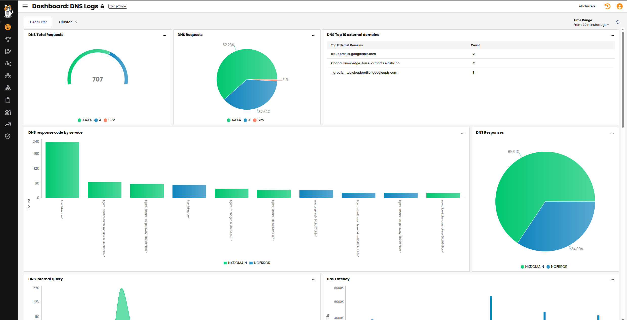 The DNS Logs dashboard summarizes DNS data and logs into metrics, providing high-level information on the types of DNS lookups made, responses, and overall DNS performance.